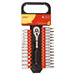- Set includes 12pc metric sockets (4 – 13mm), 14pc bit sockets (slotted, Phillips, Torx and hex), 1pc ratchet handle with forward and reverse function