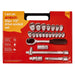 - The versatile set includes a 1/2" drive quick release ratchet, a 125mm extension bar, a universal joint, a 250mm sliding T-handle extension bar, spark plug sockets, and a useful assortment of flank drive sockets in sizes ranging from 8mm - 32mm